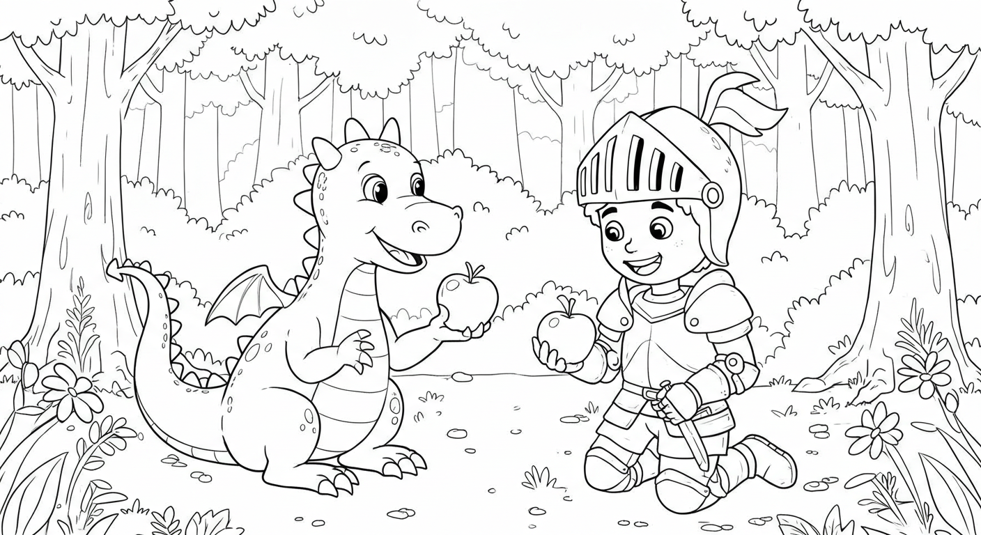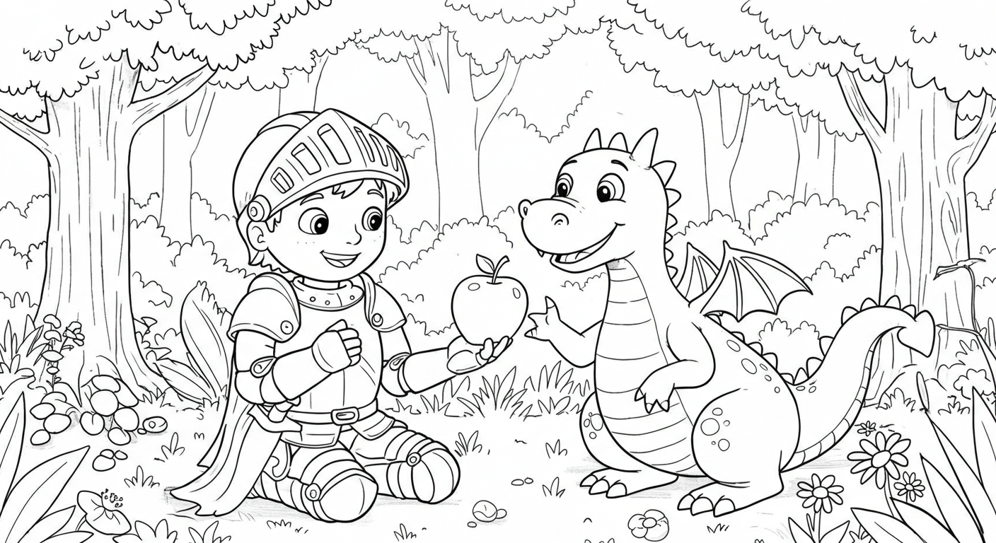 깊은 숲 속, 용감한 꼬마 기사가 커다란 눈망울의 아기 용과 만났어요! 서로 사과를 건네는 모습이 정말 다정해 보이죠? 이들의 우정 이야기를 상상하며 멋지게 색칠해 주세요.