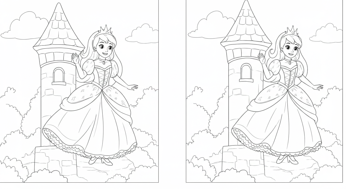 네 번째 그림 역시 탑 위의 공주님을 다른 각도에서 보여주네요. 틀린 그림 찾기처럼 비교하며 칠하는 재미도 있을 거예요!